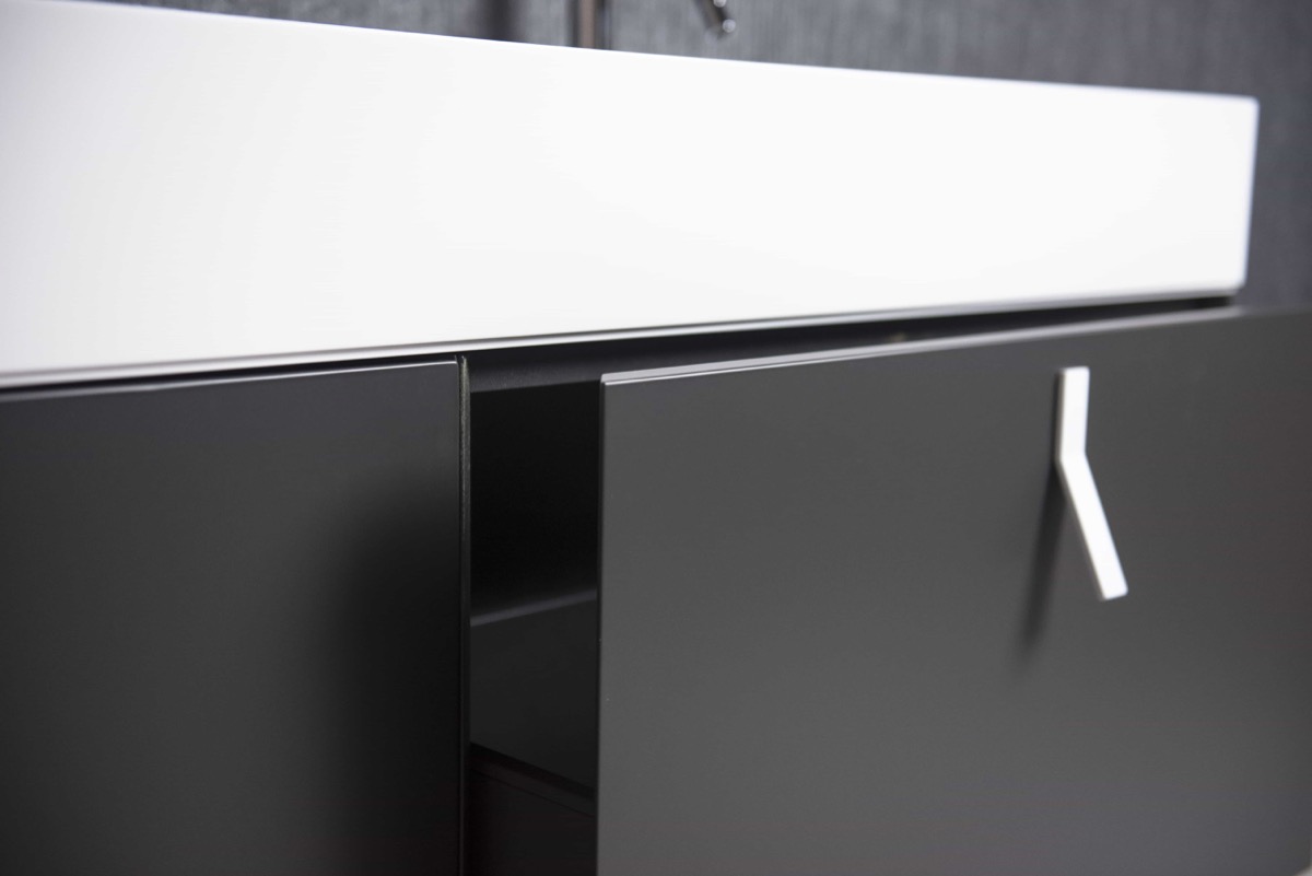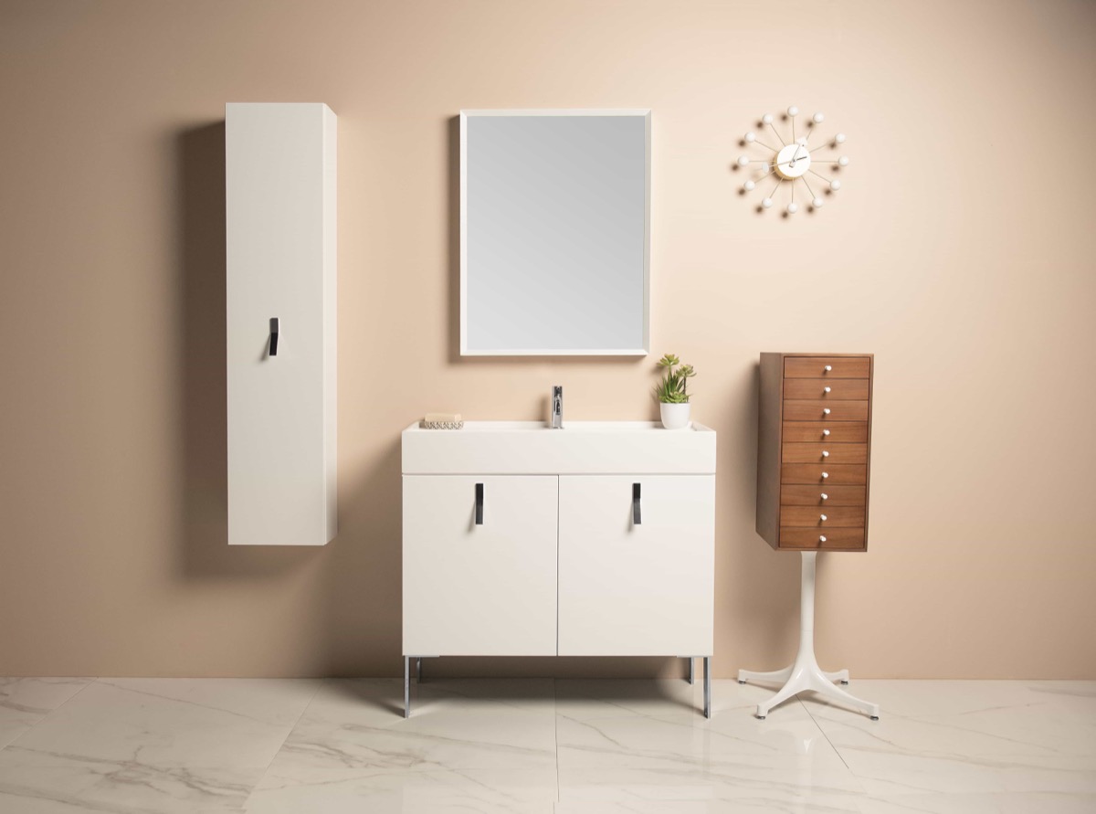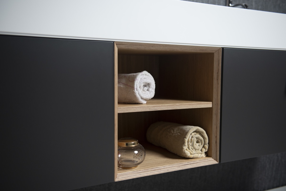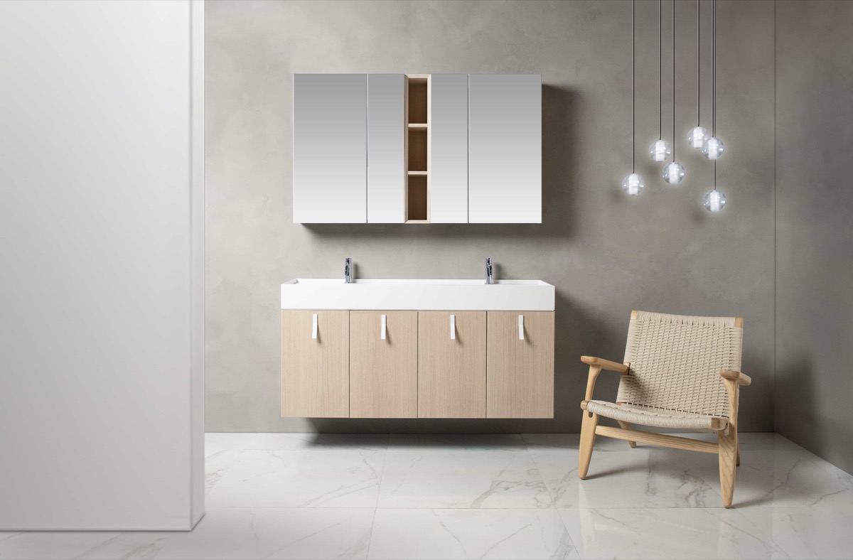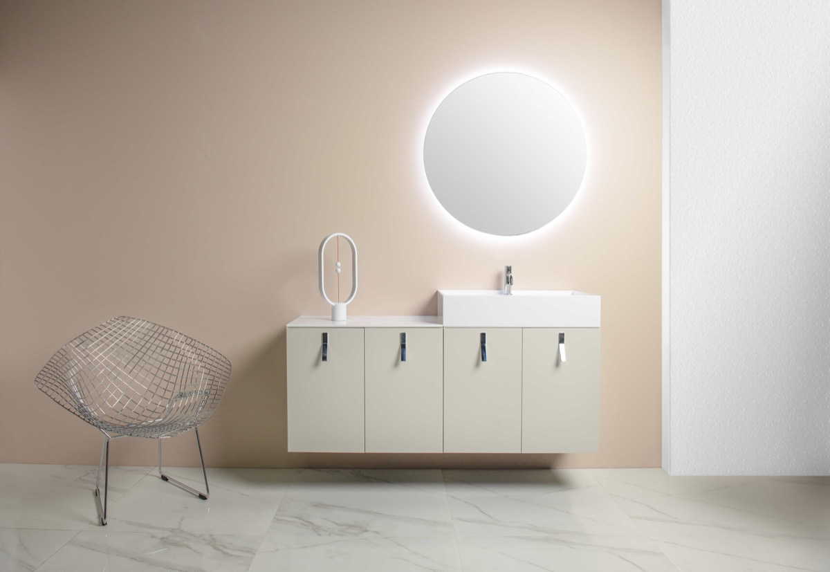 Step es un mueble de baño con identidad propia. Su puerta curva de radio 15 cm no solo aporta un estilo retro sofisticado, sino que además optimiza el espacio interior, incorporando un estante funcional que permite mantener el orden sin renunciar al diseño. Un mueble que invita a dejarse llevar por las formas.